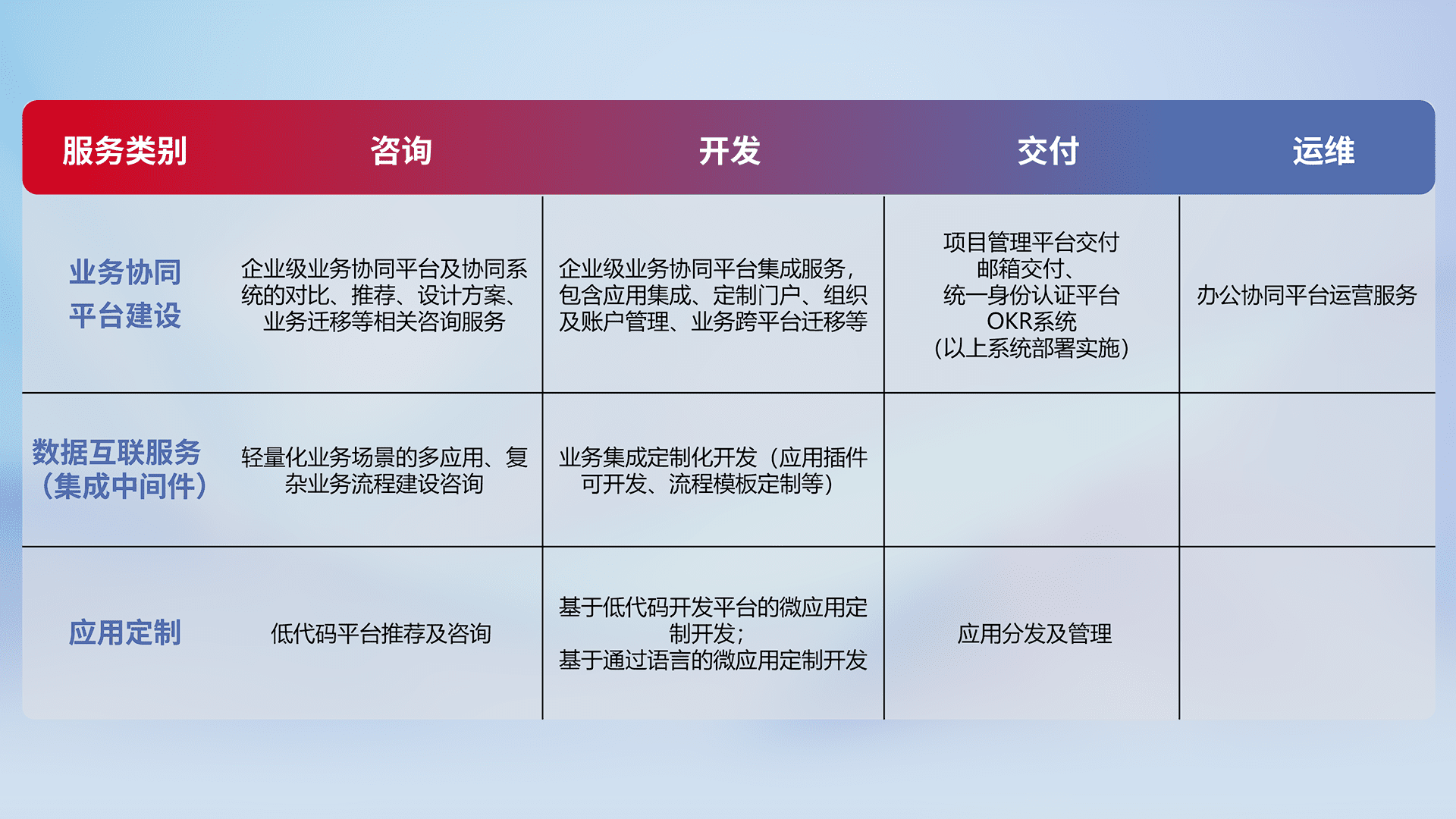 针对钉钉、、、企微、、IDaas等平台级产品提供产品的规划、、方案、、、交付、、、定制化开发等服务,,,,实现如统一协同办公、、、智能客户服务、、、混合会议管理、、、智能数据查询、、等业务场景,,实现数字化转型。。。